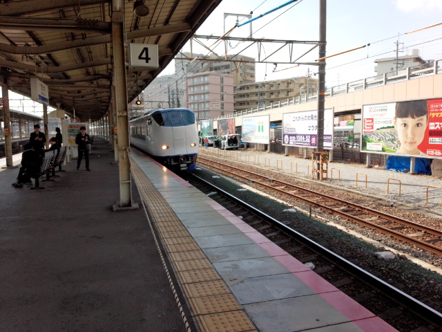 JR茨木駅で電車を待っていると、次々に特急電車が通過していきました。ホームでカメラを構えると予想以上のスピードに驚かされます。