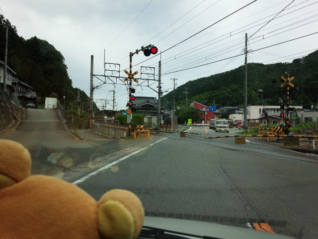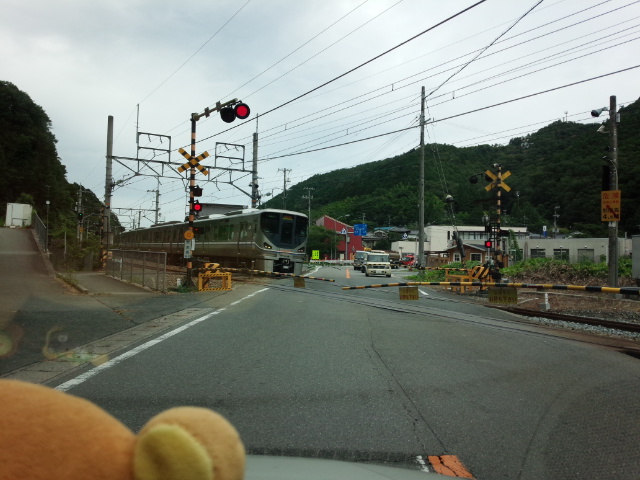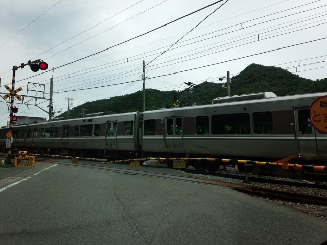 福知山線(ふくちやません)の古市駅(ふるいちえき)の近所(きんじょ)の踏切(ふみきり)です。快速電車(かいそくでんしゃ)がやってきました。