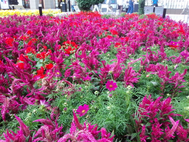 赤紫の花と赤い花が目を喜ばせてくれます。視覚刺激と嗅覚刺激でお花畑を目にすると軽い興奮状態になるみたいですね。