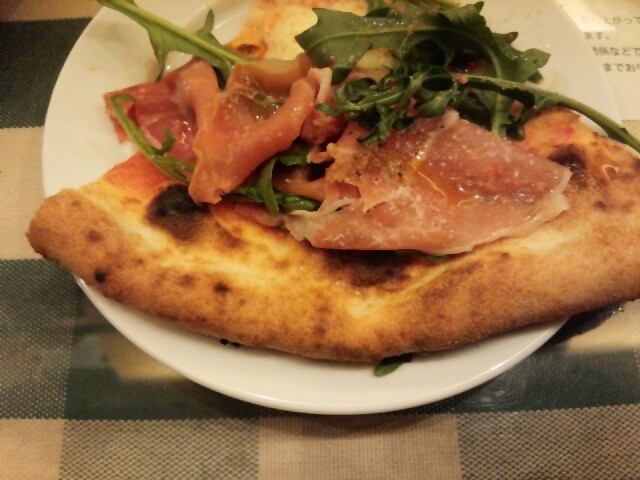 そしてこれがマルゲリータ コン プロシュート エ ルッコラというピザです。ルッコラがいっぱい乗っていてからーい油を少しだけかけていただきました。生ハムもおいしかったです。