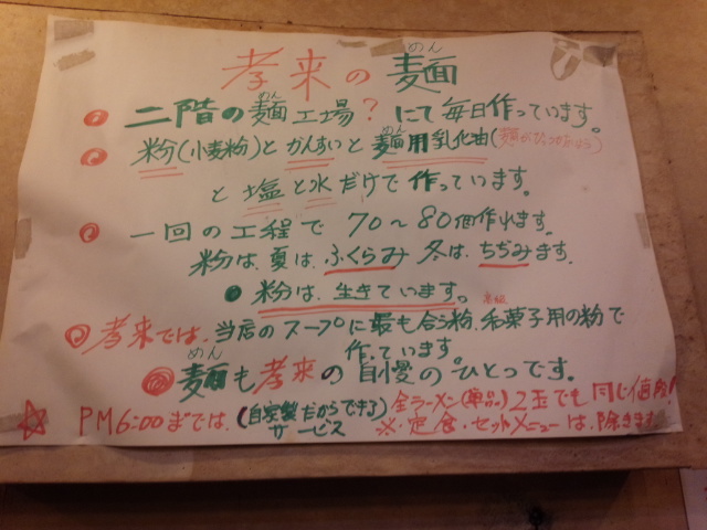 この店の二階で麺を作っているそうで壁に麺についての説明が書いてありました。この文を読むと和菓子用の粉で作っているそうです。