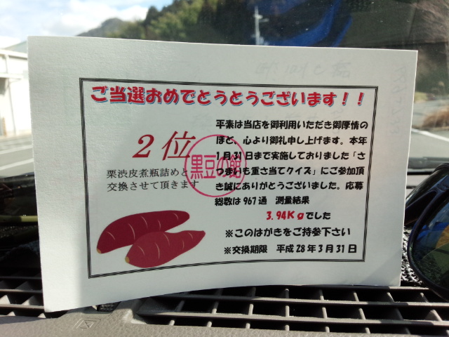 昨年末に訪れた篠山の黒豆の館からはがきが届きました。サツマイモの重さ当てクイズに応募した友人が見事二位になり、栗の渋皮煮がもらえるというのでさっそく訪れました。