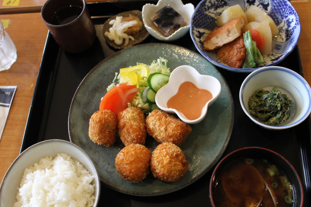これが今日のランチです。鮭ボールという献立でしたが、コロッケの中に鮭の身が入っていました。イカ天と丸大根の煮物もおいしかったです。