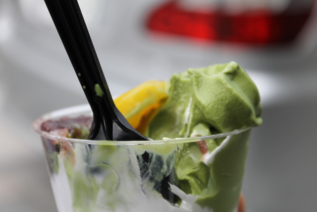 宇治で食べた抹茶ソフトです。源氏パフェだったかな。おいしかったです。