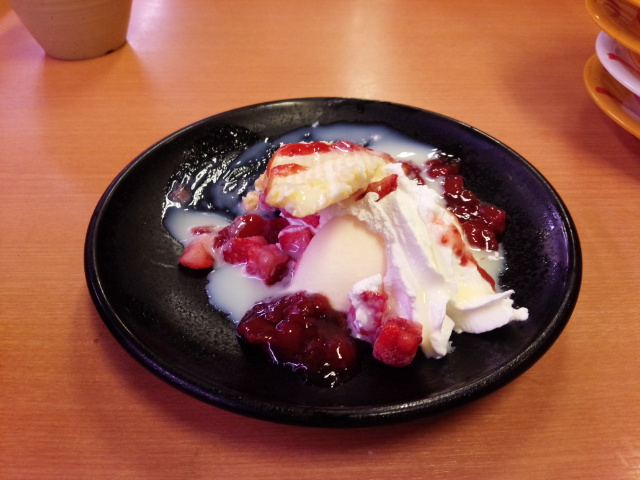 最初(さいしょ)ベルトの上(うえ)を流(なが)れていくこの皿(さら)を見(み)て、アイスクリームが溶(と)けてぐしゃぐしゃになってると思(おも)ったのですが、そうではなくて練乳(れんにゅう)がかかっていたのです。イチゴとアイスクリームとクレープに生(なま)クリームそして練乳(れんにゅう)という5つの味(あじ)が合(あ)わさって不思議(ふしぎ)においしかったです。忘(わす)れかかってますが確(たし)か180円(えん)だったと思(おも)います。