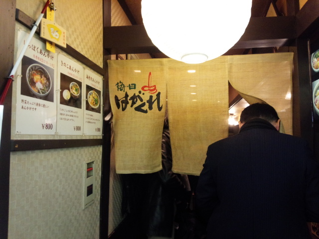 大阪駅前第3ビルの地下2階にある『はがくれ』といううどん屋さんに行きました。4人ほど並んでいてその後に並ぶと、お店のおばさんから注文を聞かれました。