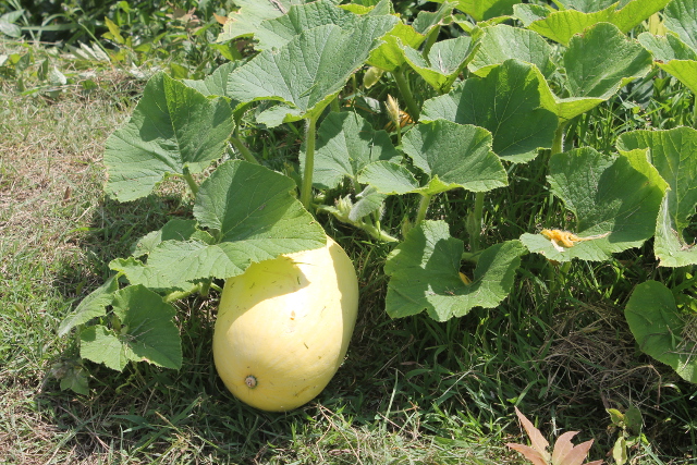 裏(うら)の畑(はたけ)に大(おお)きな冬瓜(とうがん)の実(み)が見(み)えました。