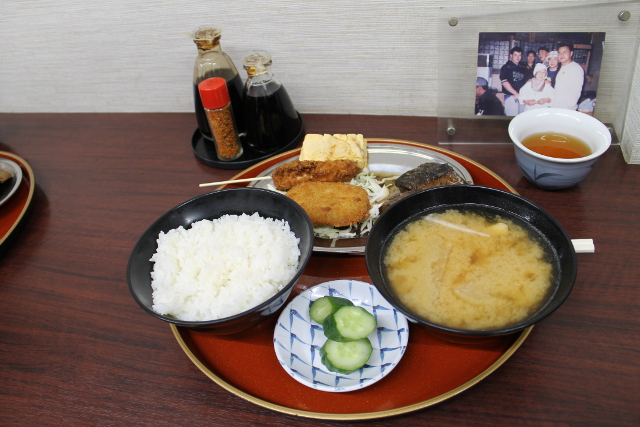 名物の鯖煮とチキンカツ、コロッケ、厚焼き卵そして大きなお椀で大根の入ったお味噌汁。
