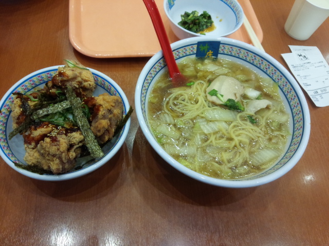 久しぶりに神座(かむくら)のおいしいラーメンをいただきました。場所は伊丹昆陽イオンのフードコートです。このフードコートの神座は店の右にある食券売り場で食券を買って左の方向に並んで、透明なガラス越しに調理の様子を見ながら順に出来上がったラーメンを手にして席に着くという方法でしたが、お店を若干リニューアルして外から調理の様子を見えなくしていました。食券を買って最近どの店でも手渡されるブーブー鳴るリモコンのようなものを手渡されました。これだと並ばなくても済むのですが、なんとなくたくさん人が並んでいた時の方がおいしい気がしたのですが、気持ちの問題なのでしょうね。一緒に注文したのが金のからあげ丼です。おいしかったです。