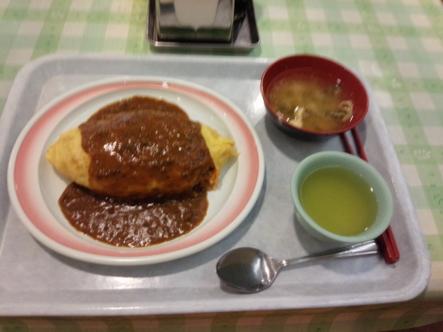 職場(しょくば)の同僚(どうりょう)と森之宮(もりのみや)のURビルの地下(ちか)にある社員食堂(しゃいんしょくどう)に行(い)きました。ビルの前(まえ)に小(ちい)さな看板(かんばん)があり、一般(いっぱん)の方(かた)もどうぞという感(かん)じなので玄関(げんかん)から入(はい)るとピンクの来客(らいきゃく)バッジを付(つ)けるようにと案内(あんない)がありました。ガードマンに教(おし)えられて階段(かいだん)を降(お)りて地階(ちかい)に行(い)きました。長(なが)い廊下(ろうか)の突(つ)き当(あ)たりに広(ひろ)い食堂(しょくどう)がありました。定食(ていしょく)がいろいろとある中(なか)で400円(えん)のカレーオムライスが目(め)に入(はい)りました。