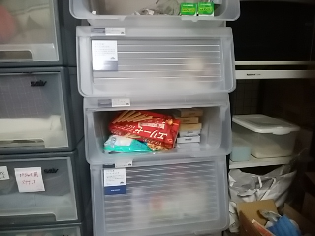 台所に置いていた食器棚が壊れてしまってからは、食べ物関係の品物を置くスペースがなくて長い間不便をかこっていました。新しく食器棚を買おうと考えていた矢先に、イオンの売り場で面白い整理棚を見つけました。売り場で店員さんにいろいろと尋ねて、M2個、S3個買うことにしました。正面から取り出すのですが、スライド式のふたが上に付いていて閉めることが出来るのです。