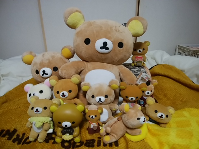 我が家に入るリラックマの大きいのやら小さいのやら、駅長さんや牛タンを焼いているのやら、勢揃いさせてみました。これ以外にクルマの中でぶらさがっているのや、カメラケースにいつもくっついているのが2体います。みんな加えると15頭ですが、この写真では13頭が写っています。