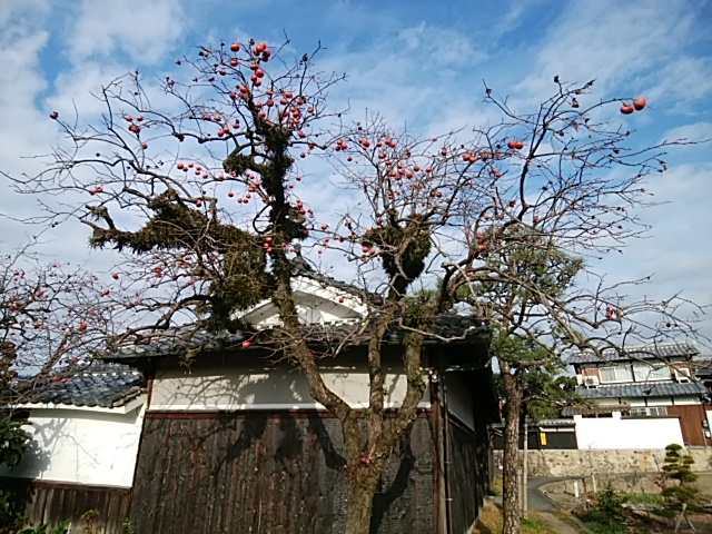 白壁のある立派な家の前に柿の木が並んで植えられていました。おそらくカラスやスズメの餌になったのでしょうね。あそこまで熟すと渋柿も甘くなってるような気がします。