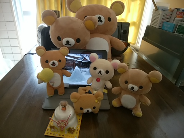 年賀状の写真をいくつか撮りました。これはリラックマたちに新年の挨拶を言ってもらっている形で撮影した写真です。iPadに写っているのは京都上賀茂神社の立砂です。残念ながらお正月の雰囲気が出ていませんね。
