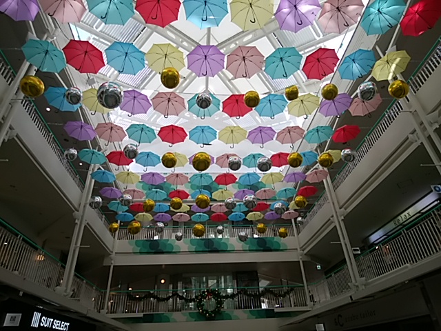 千里中央の千中パルの天井にカラフルな傘が並べられて通りが明るくなっていました。