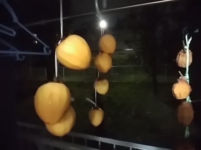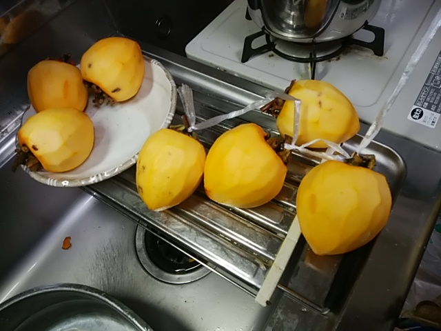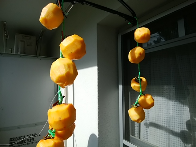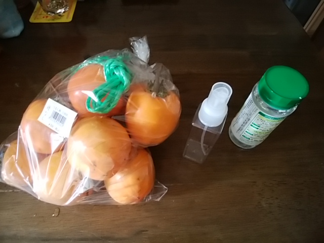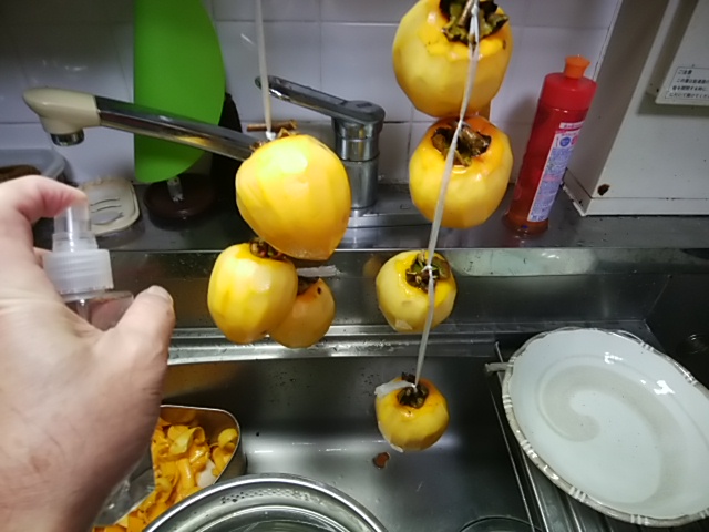 売店のお姉さんに教えてもらったとおり、柿の皮を剥き、熱湯に10秒間つけて紐にくくりつけベランダに干してから霧吹きに入れたホワイトリカーを吹き付けました。