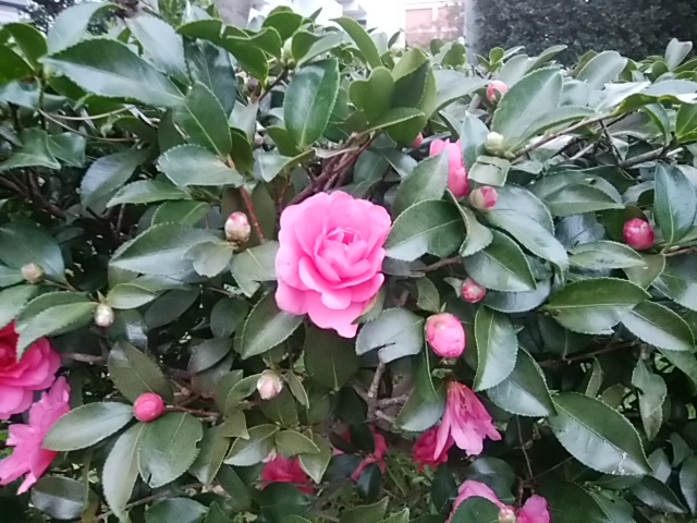 ピンクのさざんかの花が咲いているのに気づきました。下の方に枯れかけた花もあるのでだいぶ前から咲いていたのでしょうが、きょうやっと気づいた次第です。この花が咲き始めると冬ですね。