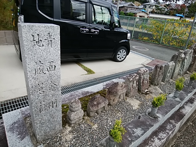 ご近所を散策すると、家の前の道路に小さな石像が並んでいるのを見つけました。一番左の石版には青面金剛と地蔵菩薩と彫られていました。小さなお地蔵さんがこんなに並んで祭られているのも珍しいと思いました。