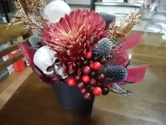 家に帰るとこんな花束が飾ってありました。真っ白などくろが二つにらんでいます。