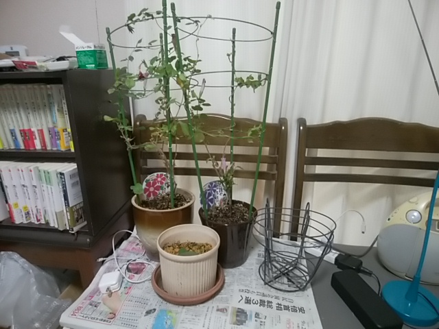 朝顔の鉢は支柱があるので椅子の上になりました。大きな鉢はベランダの隅にギューッと固めて並べました。