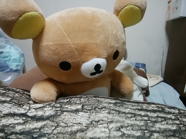 夕方、家に帰ると私のベッドの上で大きなリラックマが丸太のクッションを眺めて何やら考えていました。何を考えているのでしょうか?