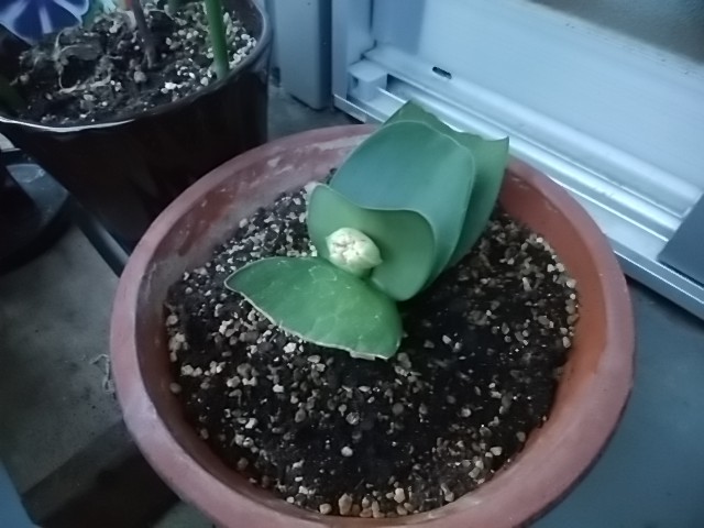 今年も眉刷毛万年青(マユハケオモト)に花芽がつきました。昨日見つけたのですが、あっという間に芽を出すのですね。ハエマンサスという名前で園芸店には並んでいるそうです。この前、高槻の園芸店で『万年青見せてください。』と尋ねると何やら葉っぱの長い大きな鉢が出てきました。マユハケオモトと伝えてもわからなかったようです。ハエマンサスといえばよかったのかも知れません。