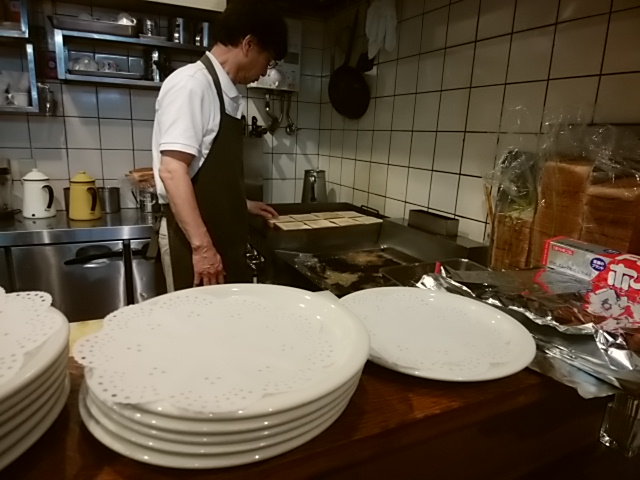 カウンターから見える厨房の様子です。並べているパンを焼いて、その横に四角い油の鍋があり、トンカツを揚げています。手前の白い皿の前でパンにカツや野菜を挟んで見事な包丁さばきで耳を取り、八つに切り分けてくれます。
