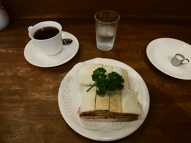 借りていたCDを返却し、新しく2枚借りました。それから駅のホーム上のアストリアという喫茶店に行き、野菜入りカツサンドとホットコーヒーを注文しました。店の前に並んだ人が「入りとホット」とかっこよく注文していたので、まねをして『入りとホット』と注文しました。