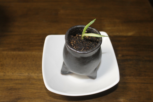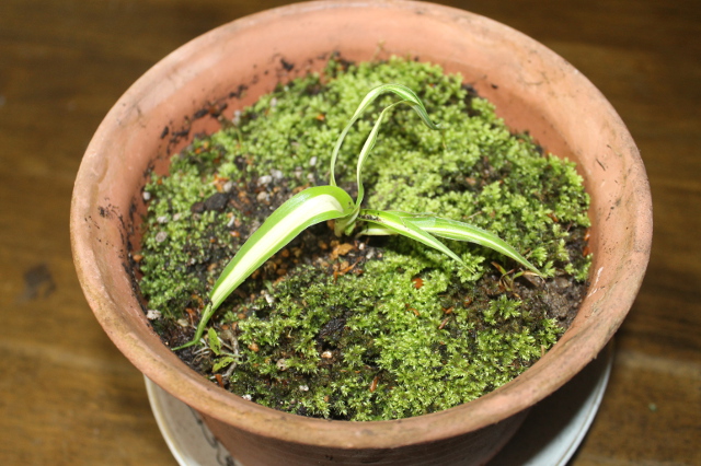 ちょっと変わった鉢があったので、絡み合っているオリヅルランを根を分けるようにしてばらばらにし、この小さな器にギューッと入れ込みました。上の葉っぱは華奢なのですが、鉢の中の根っこは、かなり立派です。