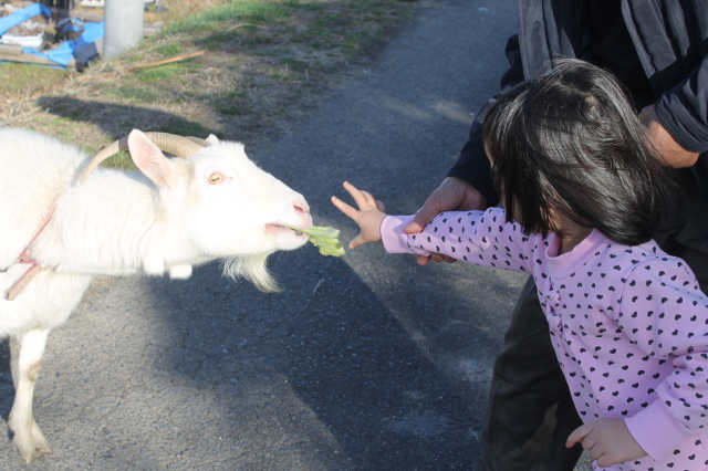 おじいさんに連れられて女の子がヤギにキャベツを食べさせにやってきました。