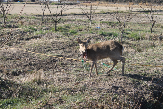 広い畑の向こうに鹿も繋がれていました。このお店のご主人が猟師さんで、仕掛けにかかった鹿だそうです。