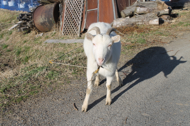 このお店の人がヤギさんを三頭飼っているというので、何のために飼っているのかをたずねると、畑の雑草を食べてもらっているということでした。きょうはブルーベリーの畑の剪定で出たブルーベリーの切れ枝をおいしそうに食べていました。1枚目の写真が夢中で食べているときのヤギさんを写しています。