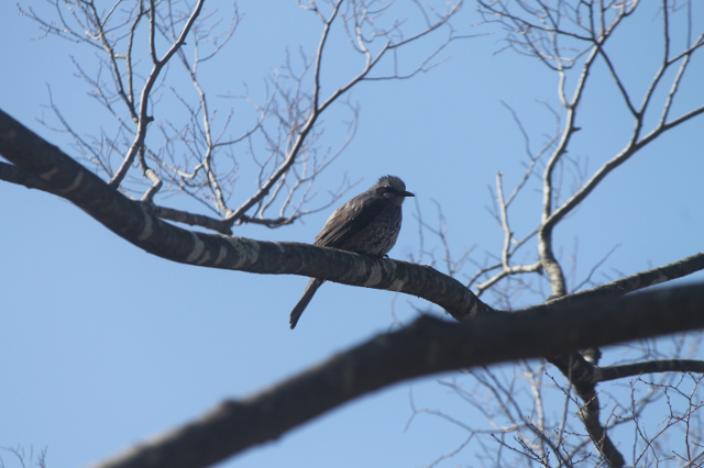 大きな木にヒヨドリが留まっていました。「ヒーヨヒーヨ」と鳴くのでヒヨドリというらしいのですが、「ピーーピーー』と聞こえました。可愛い目をしていました。