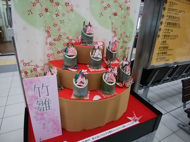 北大阪急行線の終点の駅、千里中央のホームにまたまた竹雛が飾られていました。