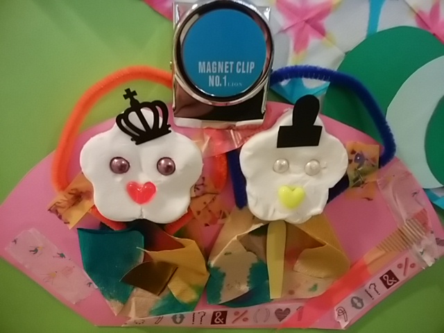 紙粘土で作ったおびな、めびなの顔やハートのビーズの口がかわいい手作りの雛飾り。