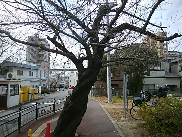 刀根山病院の入り口に大きな顔をして枝を張る桜の老木です。歩道の真ん中に、太い幹が斜めに突き出ていてこの道を歩く人は誰もがこの木を意識することになります。この4月にはまた立派な花を咲かすことでしょう。