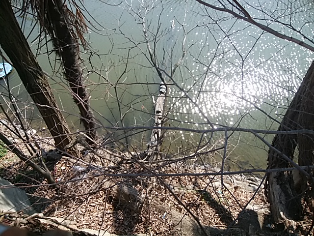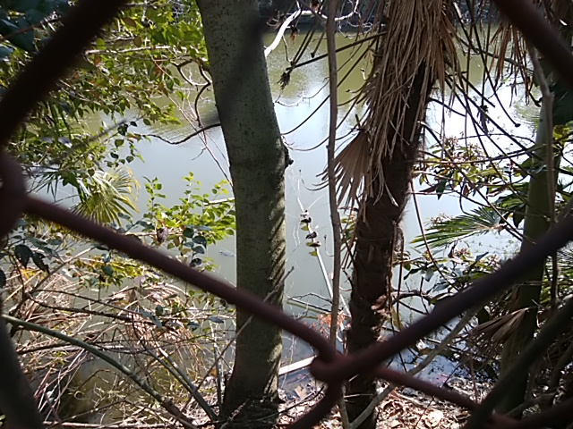 池の中央に真っ直ぐ出ている木?に小さなカモが四羽並んでいました。みんな同じ方向を向いておそらく居眠りしているのではないでしょうか?金網越しで鬱蒼とした樹木の向こうだったのでかなり撮影が困難だったのですが、何とか一枚ましなのが見つかりました。