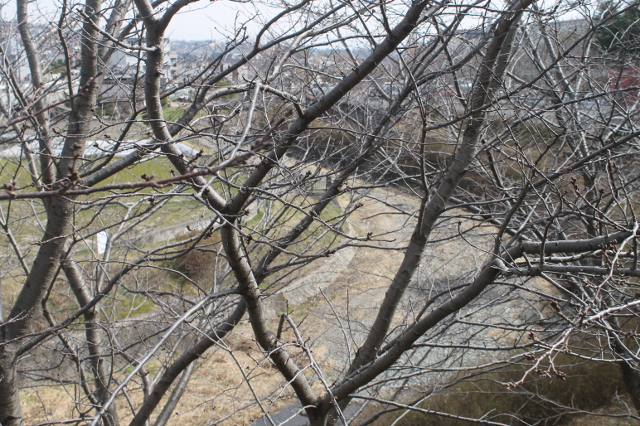 葉を落とした桜の木の間から勝尾寺川を撮影してみました。まさに冬のそれも玄冬、白黒の冬の世界です。やがてこの景色が緑と赤と黄色と桜のピンクに彩られてきます。川の水さえ水色に見えてきます。まさに春待つ景色です。