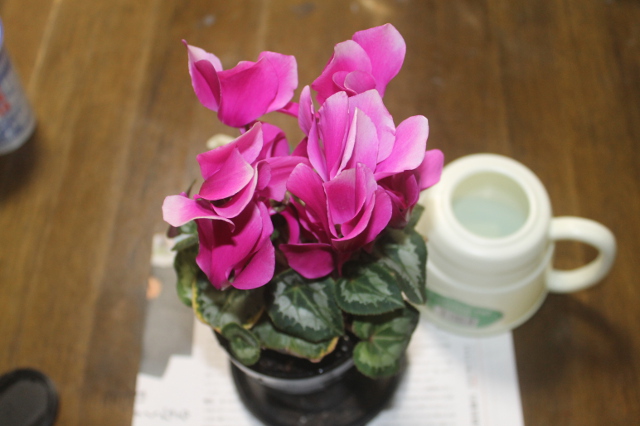 近所の花屋さんでシクラメンの花苗が半額で売り出されていたのでつい買う気になってしまいました。花の苗が半額で180円、もしあればと声をかけてみた陶器鉢が360円で、この鉢の方が値打ちありそうです。