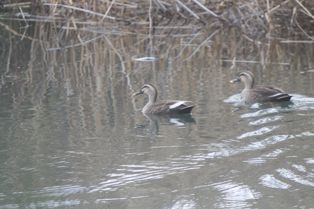 箕面のキューズモール横の池で撮影しました。二羽のカモの反対側に一羽のやや小さなカモがいました。二羽のカモの子どもでしょうか?カメラを構えてしばらくするとこの二羽はバッサバッサと羽根を動かして大空高く飛んでいきました。