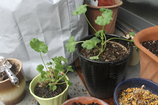 去年、挿し木したゼラニュームが室内でどんどん大きくなっていたので、ベランダに出して少しは寒さと太陽を味わってもらおうと考えました。