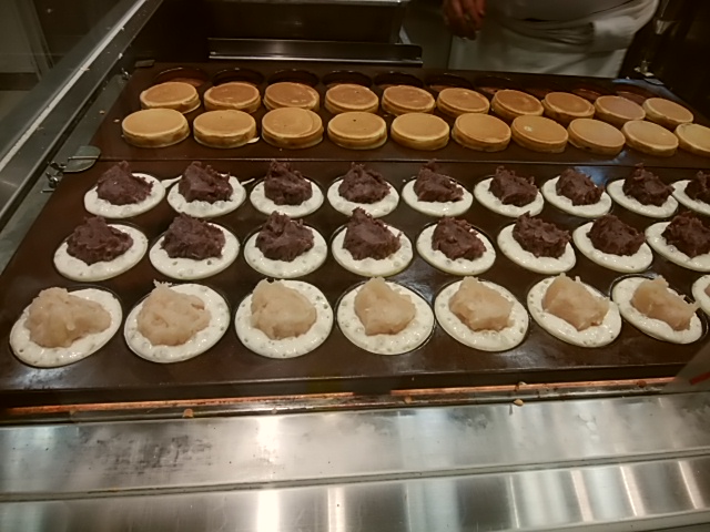向こうの二列はもう完成に近い状態でこのあと職人さんが素手で1個ずつつかんで容器に並べていました。空になった向こうの三列にチョンチョンチョンと粉を練ったのを一つずつの型に入れていき、そこへ手前のあずきの入った半分を載せていきます。