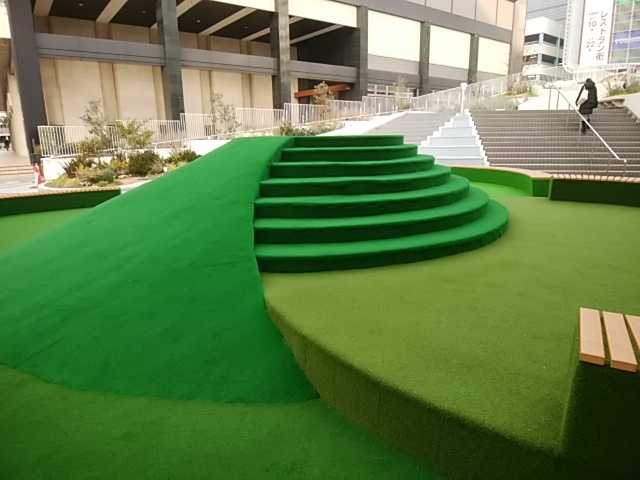 千里中央でちょっと面白いものを見つけました。いつからあるのか知りませんが、小さい子どもの遊び場なのでしょうか?柔らかいみどりのじゅうたんのような床材と階段と滑り台です。