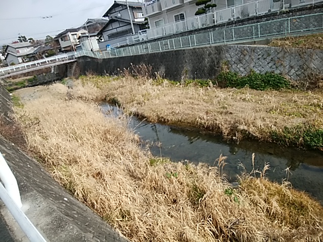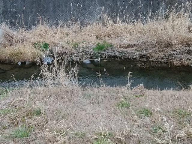 カモが二羽悠々と川で泳いでいたのですが、カメラを向けるとバサバサと水から上がってどこかへ飛んでいきました。波立っている上流の方にカモが入るのですが、草で隠れてしまいました。