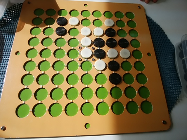 視覚障害の人はこのように両方の手の指で触りながら、黒石と白石の場所を確認して戦況を把握しています。ちなみに今日はこの碁盤の人との対戦は1勝1敗でした。