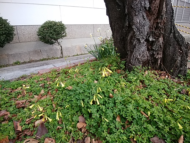 阪急高槻市駅から高槻市のゆー・あいセンターに向かう途中で面白い花が咲いているのを見つけました。大きな木の向こうに水仙の花が見えますが、手前に黄色い花が咲いているのがわかりますか?ネットで懸命に調べてみたのですが、なかなか該当する花が見つけられません。