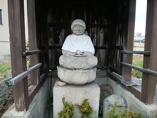 箕面の粟生間谷から大阪大学外国語学部へ通じる田んぼの中の道にずーっと昔からいてはるお地蔵様です。大きな立派な祠をこさえてもらっても、まわりが田んぼなので風がすごいです。