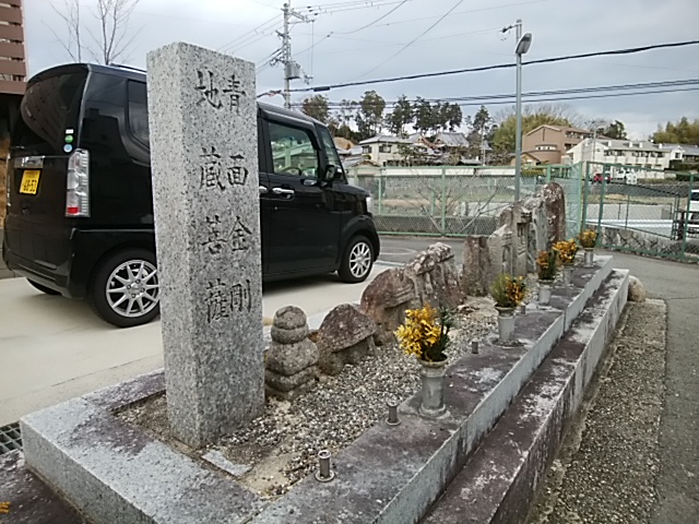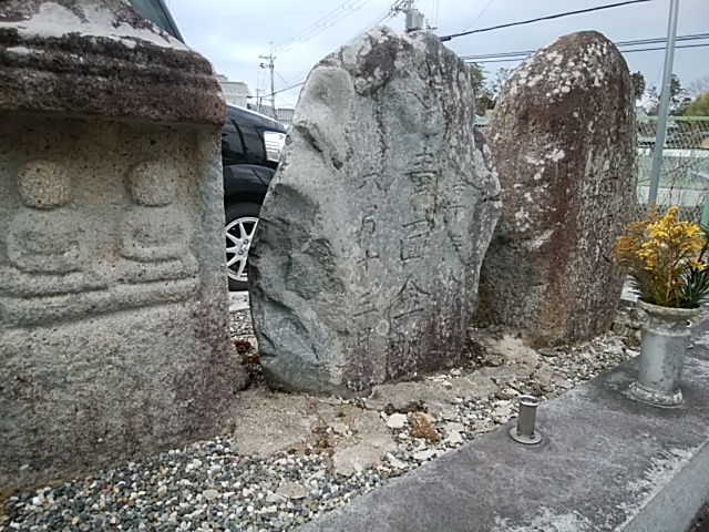 おそらくこの真ん中のが他のに比べて青い石なので青面金剛菩薩ではないかと思われます。
