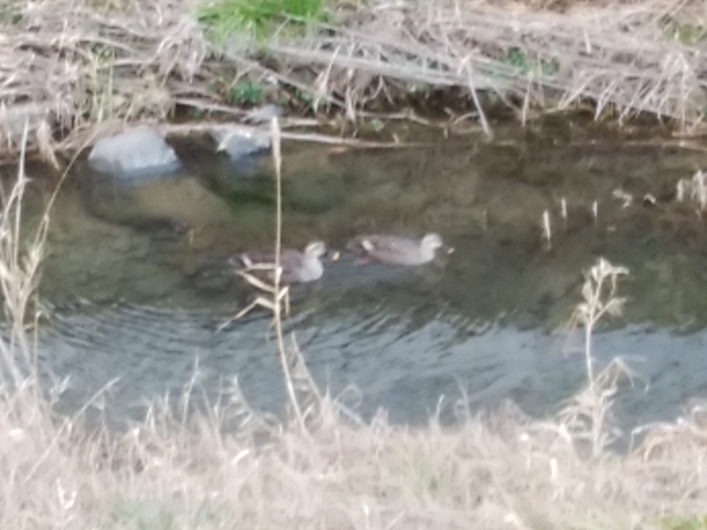 勝尾寺川にカモが二羽、泳いでいました。この前も見かけたのですが、少しでも近づくとパッと飛びたってしまうのできょうはじっと動かずかなり遠いところからスマホを構えました。