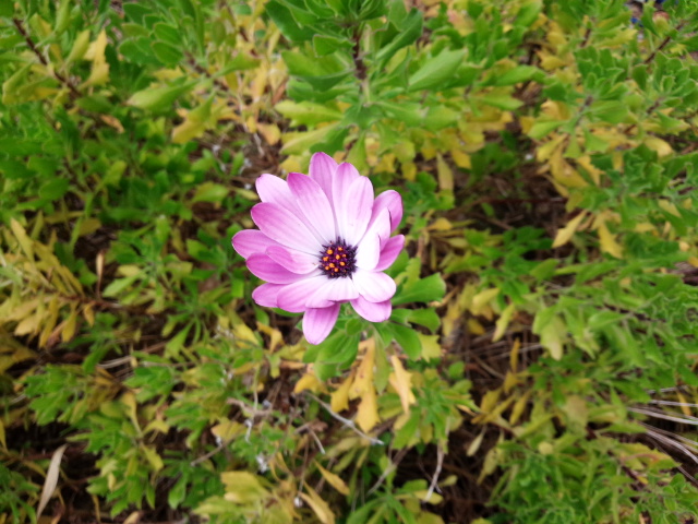 オステオスペルマムと言う花だそうです。ディモルフォセカと言うのが一年草でオステオスペルマムは宿根草だそうです。どちらもアフリカ原産の花で和名はアフリカ金盞花(きんせんか)だそうです。